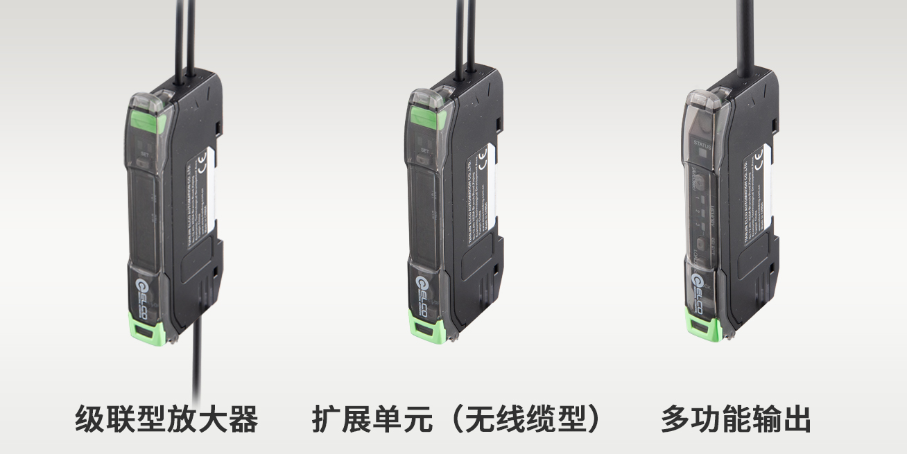 智能网关+扩展单元+多功能输入应用(预发布):智能网关可直接级联光纤放大器扩展单元和多功能输入模块, 多功能输入可为客户提供其它数字量传感器输入接口,网关 可通过Ethernet/IP将光纤放大器和多功能输入信号上传至PLC