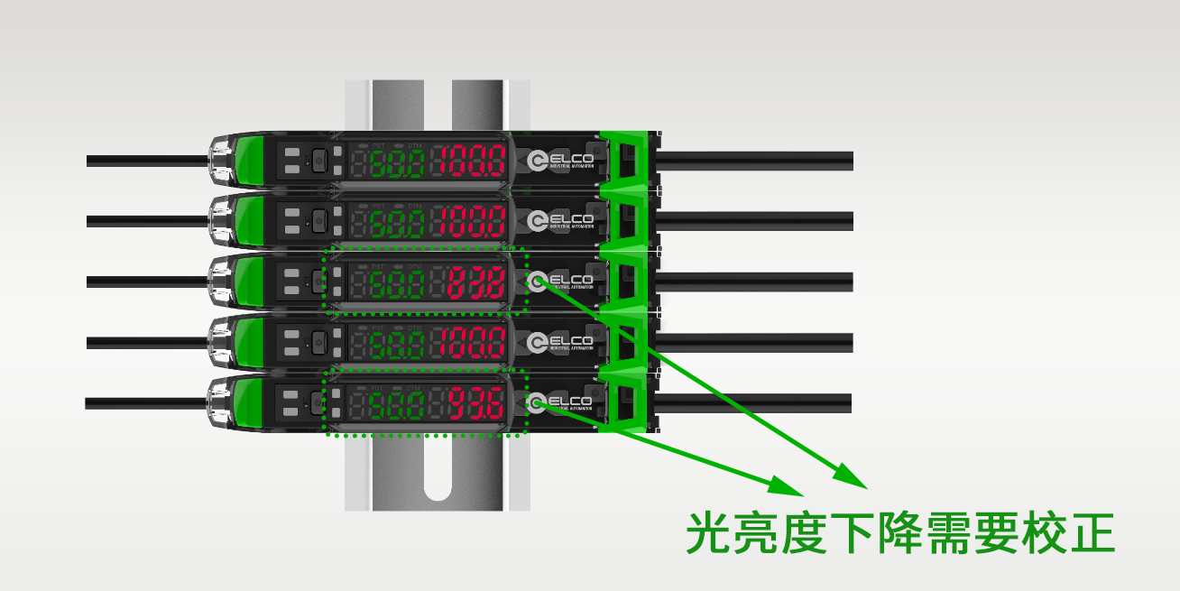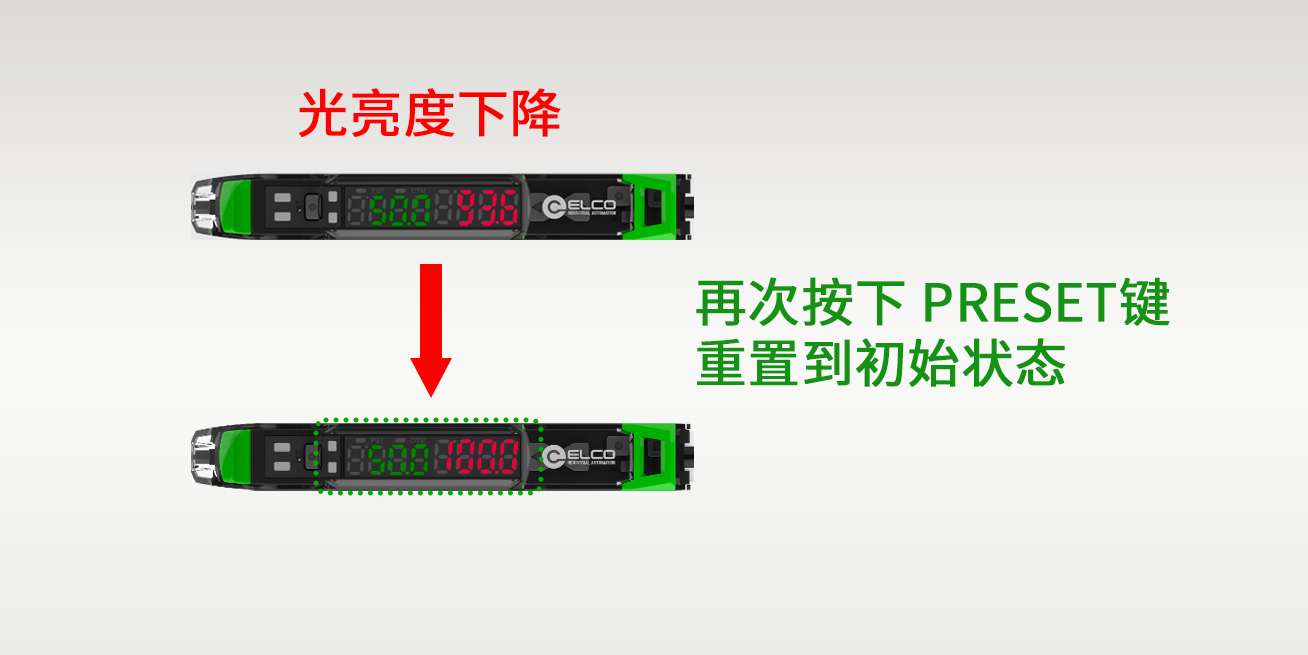 一键预设值功能:多个传感器级联使用,只需一键即可完成设置,按PRESET 按钮一次即可同时设置灵敏度并将显示值重置为100。使用多个传感器时预设功能的作用更加突出,轻松快速地找到变脏或偏移的传感器。只需按下主单元上的 PRESET 键即可完成一键式复位