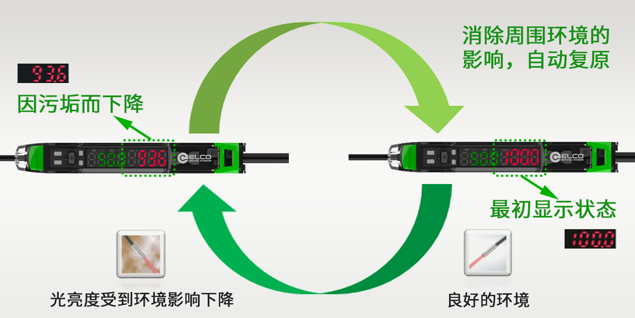 自动维护功能——DATUM:自动维护功能可察觉光亮度因污垢或其他原因而下降,并将传感器复原到最初的显示状态。 该功能可消除周围环境的影响,使传感器能够持续进行高精度检测