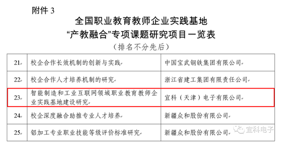 宜科申报的“智能制造和工业互联网领域职业教育教师企业实践基地建设研究”项目成功入选首批全国职业教育教师企业实践基地“产教融合”专项课题研究项目。宜科作为项目承担单位,通过开展智能制造和工业互联网领域职业教育教师企业实践基地建设研究,制定适合智能制造和工业互联网产业发展的人才培养方案和课程体系,为高校、企业和机构开展智能制造和工业互联网人才教育培训提供实施参考。